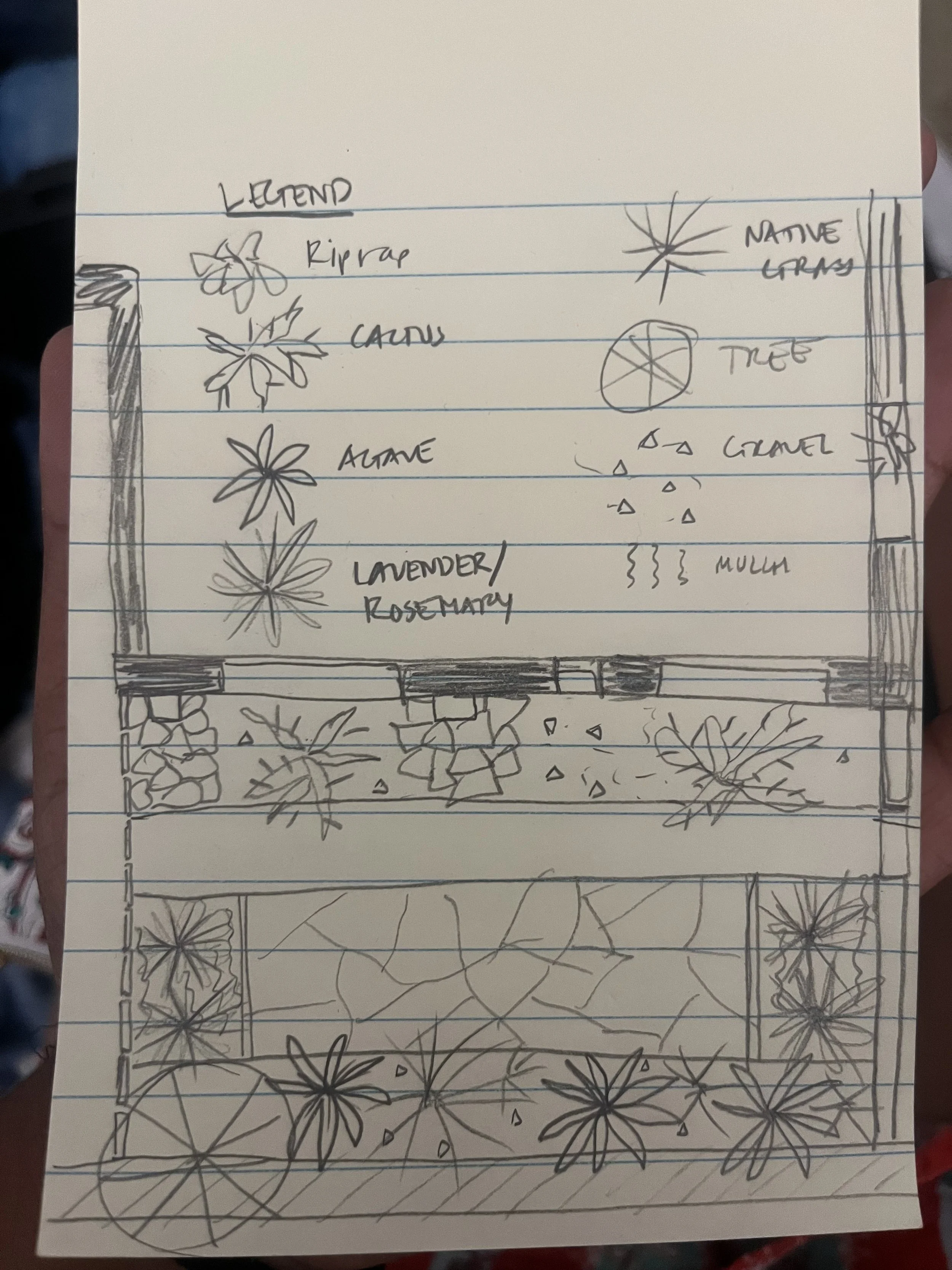 One day, it occurred to me that the connection with nature I sought could happen right at home, in my own backyard. I could cultivate the healing power of nature into my daily life through landscape design. I created a quick sketch of a layout for the backyard, as shown on right. I envisioned my backyard as an “outdoor living room” - it included a central flagstone patio as a gathering space, flanked by native vegetation and fragrant plants including rosemary and lavender.
