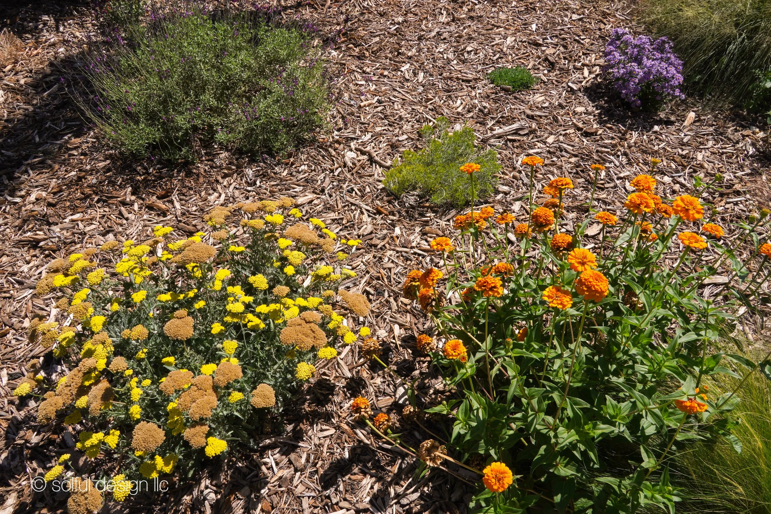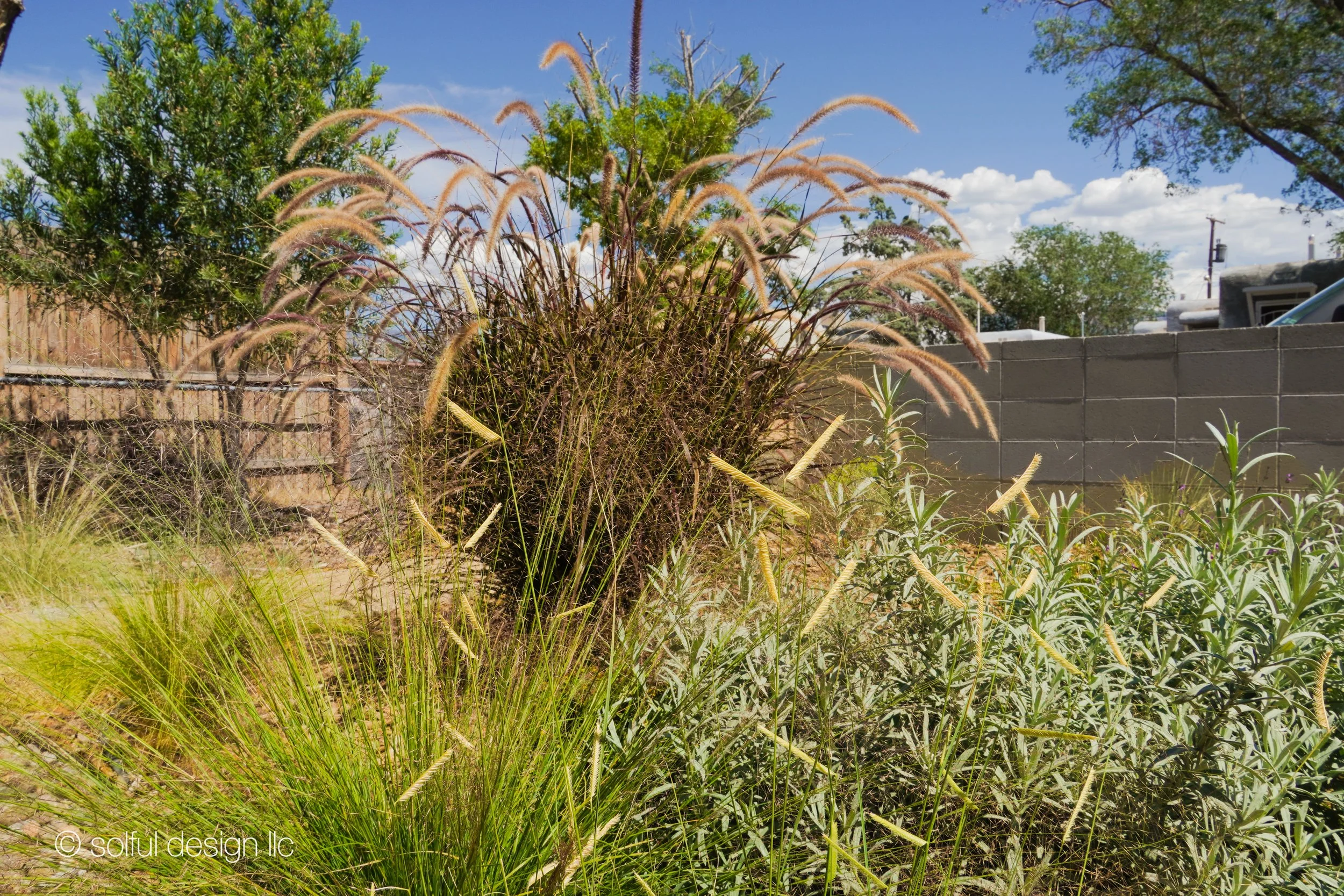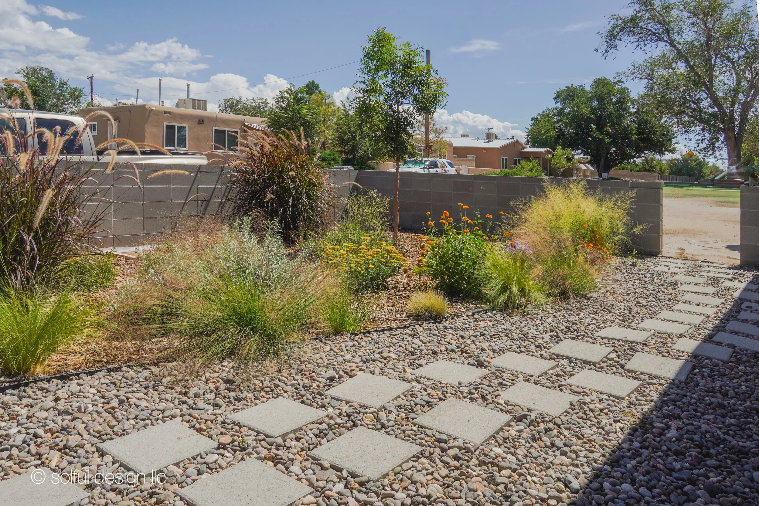 This once blank front yard has been transformed into a vibrant, welcoming entry garden that celebrates the beauty of the seasons. Native and climate-adapted plants were chosen not only for their resilience but also for their ability to attract pollinators and provide waves of color and texture throughout the year. From spring blossoms to summer blooms and the soft, cotton-like seed heads of chamisa in winter, the landscape is always alive with change.